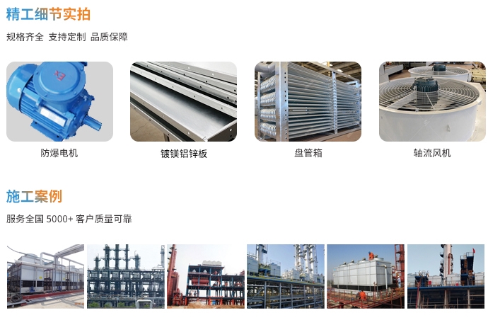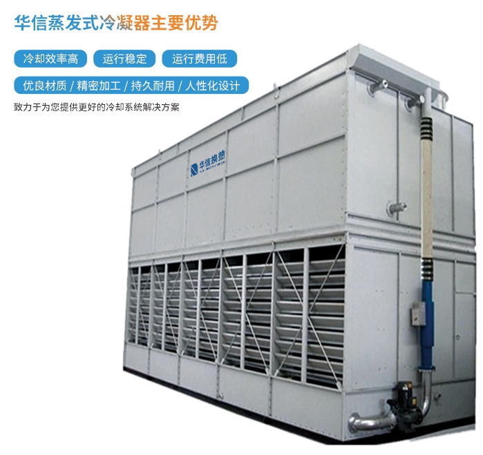 蒸發式冷凝器又叫蒸發冷、冷卻(凝)器,是由制冷利用盤管外的噴淋水部分蒸發時吸收盤管內高溫氣態制冷劑的熱量而使管內的制冷劑逐漸由氣態被冷卻為液態的一種設備。由專用軸流風機、噴淋嘴、電子水除垢儀、集氣囊、填料、高效除水器、冷卻管組、填料集水槽、水泵、集水器、箱體等部件組成。